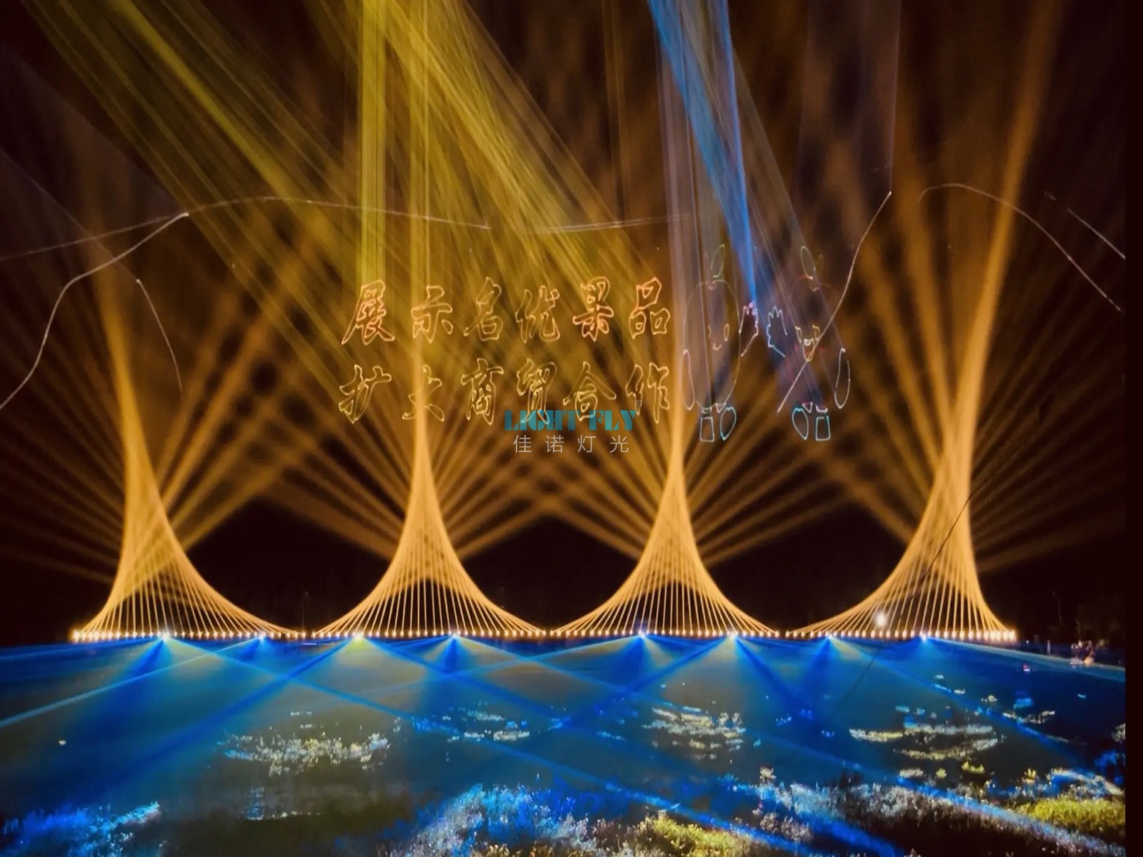為了吸引全國各地的游客,打造了一場夢幻山體雕刻激光燈秀,佳諾燈光LIGHT FLY設(shè)計了8臺100W全彩激光燈與180臺480W防水光束燈放置于山體角落,實現(xiàn)了激光光束與光束燈七彩光束效果,山體對面設(shè)計了8臺雕刻激光燈,通過進口BEYOND雕刻激光軟件實現(xiàn)了任意動畫與文字的相結(jié),實現(xiàn)了精彩絕倫的動畫激光效果也打造了特色文化與產(chǎn)品的宣傳廣告效果,得到了領(lǐng)導(dǎo)與游客們一直贊賞.